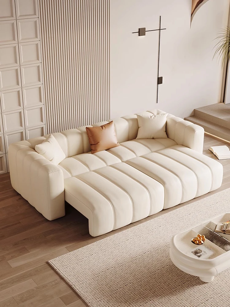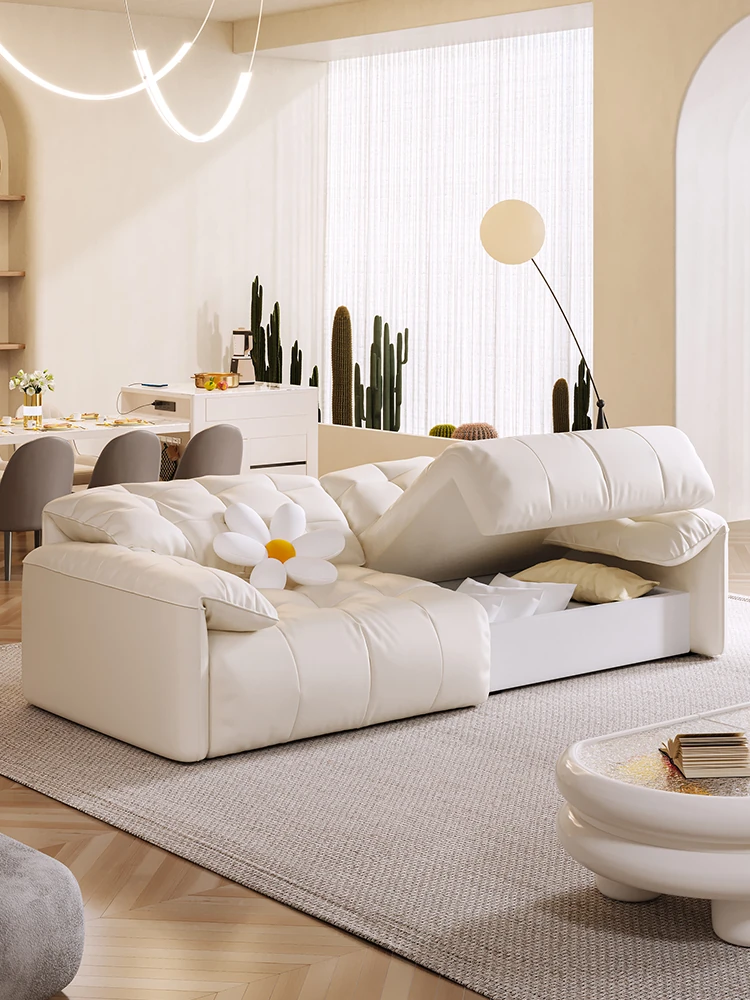 Luxurious Multifunctional Leather Sofa Bed for Small Living Rooms - Creamy Cloud Design with Pull-Out & Adjustable Features, Perfect for Modern Homes