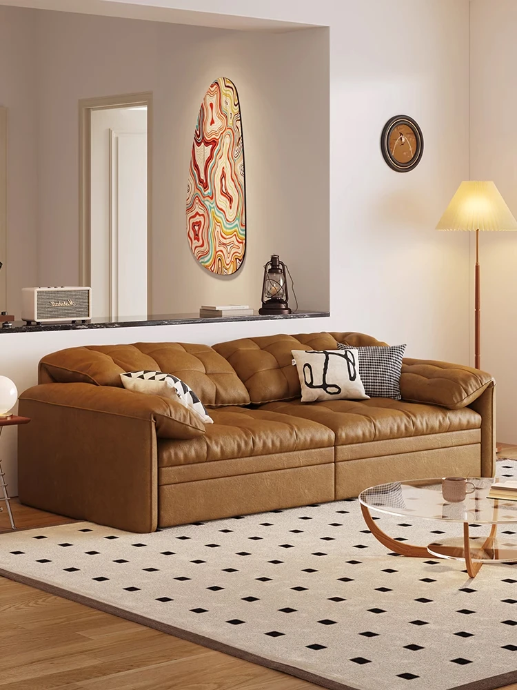 Vintage-Style Modern Minimalist Genuine Leather Sofa Bed Set for Small Living Rooms – Cloud-Like Comfort with Premium Top-Grain Leather and Built-in Storage Solutions