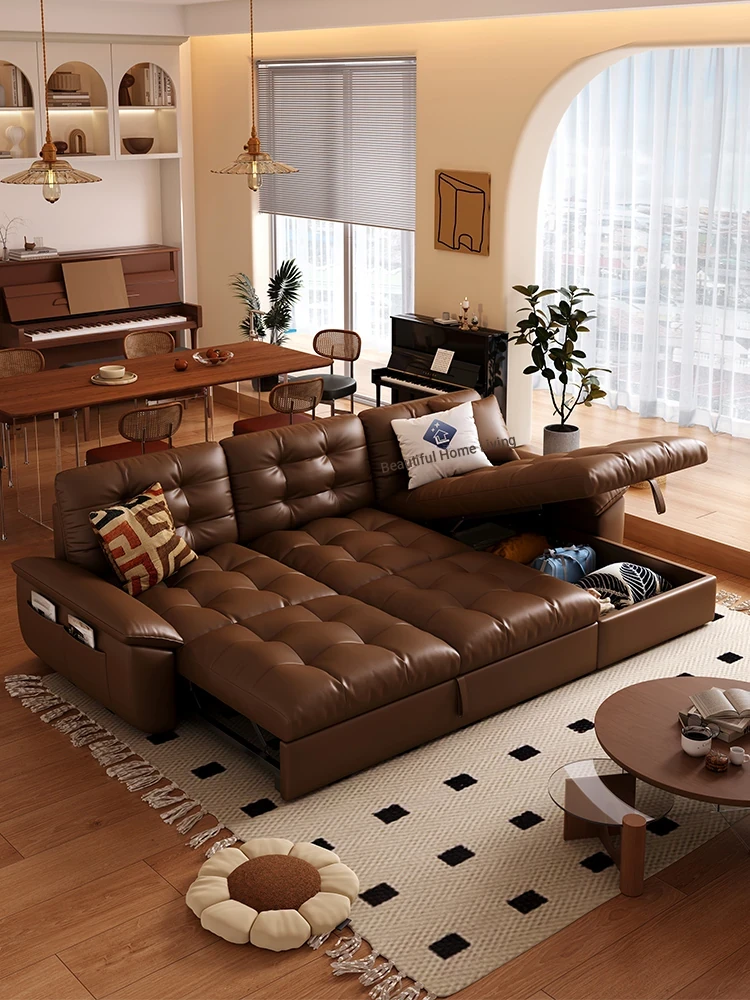 Vintage-style Italian Minimalist Genuine Leather Sofa Set with Storage - Perfect for Small Living Rooms, Featuring Cloud-like Top-grain Leather and a Sofa Bed Function