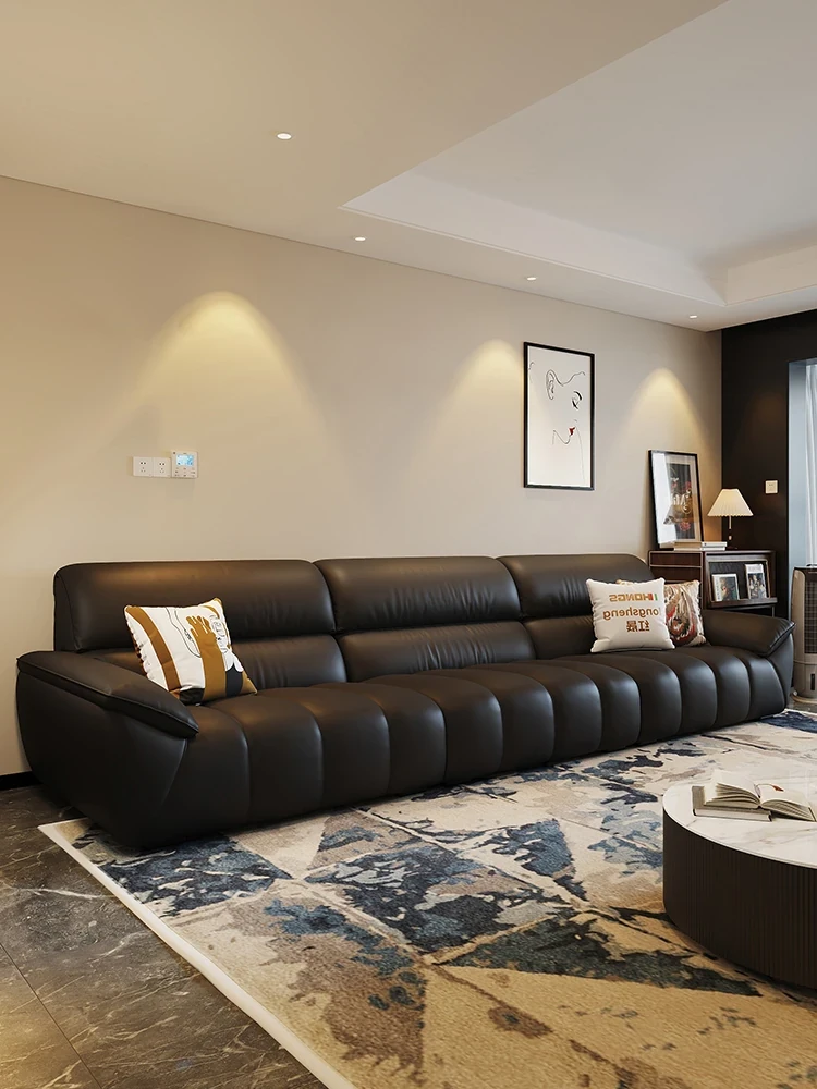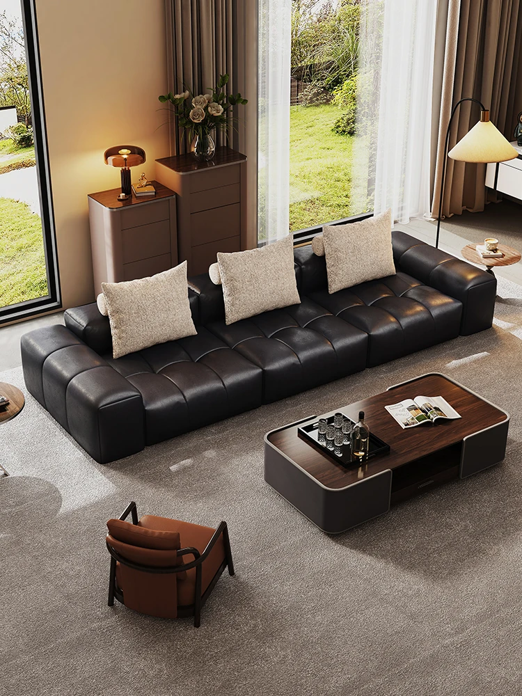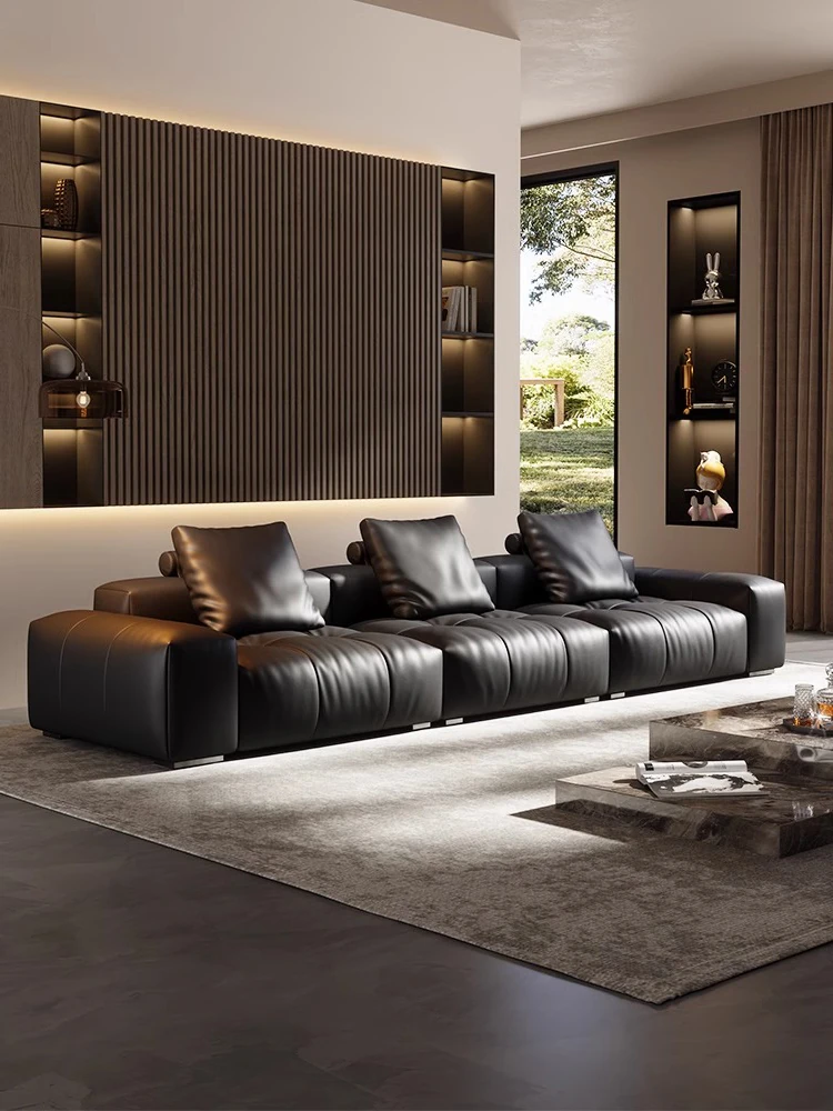 Italian Minimalist Design Leather Sofa - Adjustable Depth, Feather & Latex Cushions, Elegant Black for Chic Living Rooms