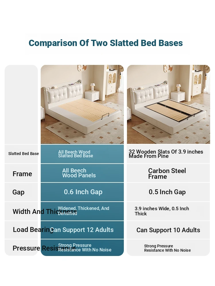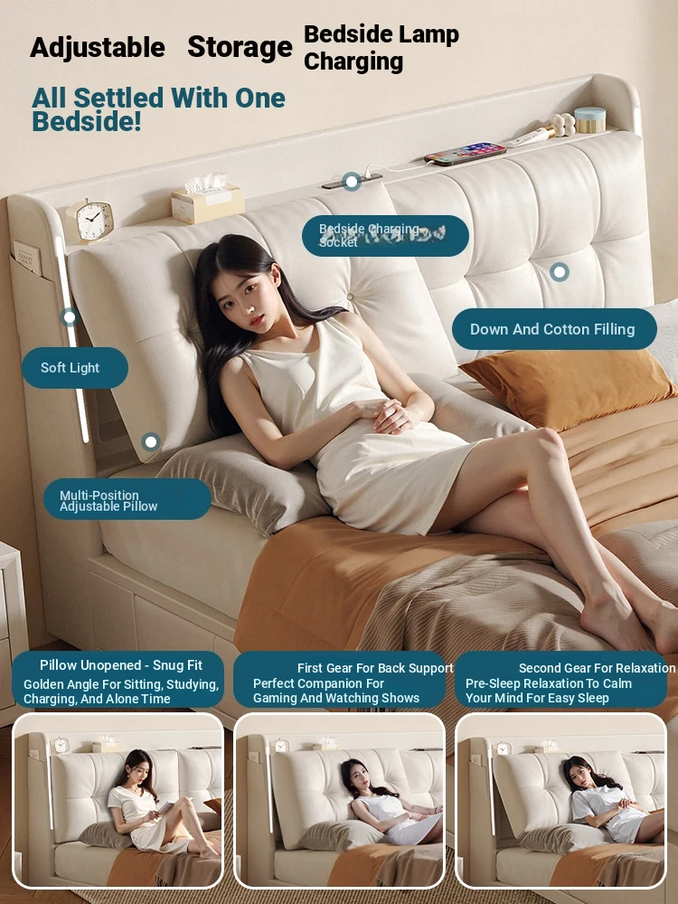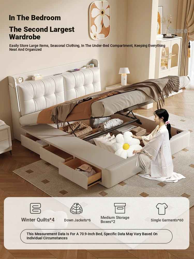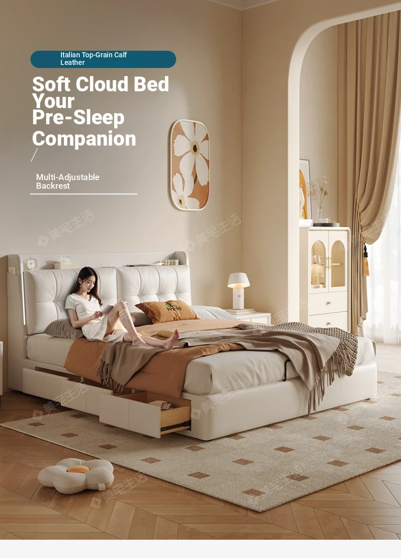 Luxurious Cream Leather Bed - Modern Multifunctional Double Bed with Solid Wood High-Storage Drawers and Soft Upholstered Headboard - Perfect for Master Bedrooms