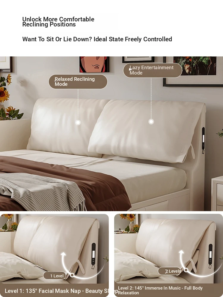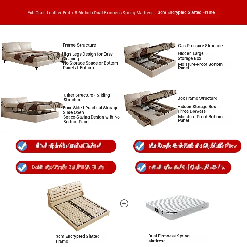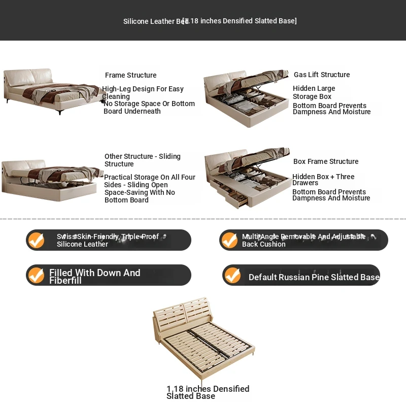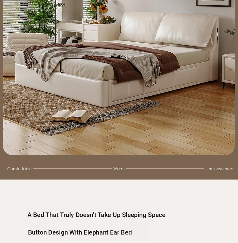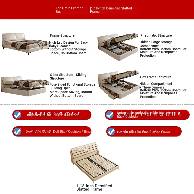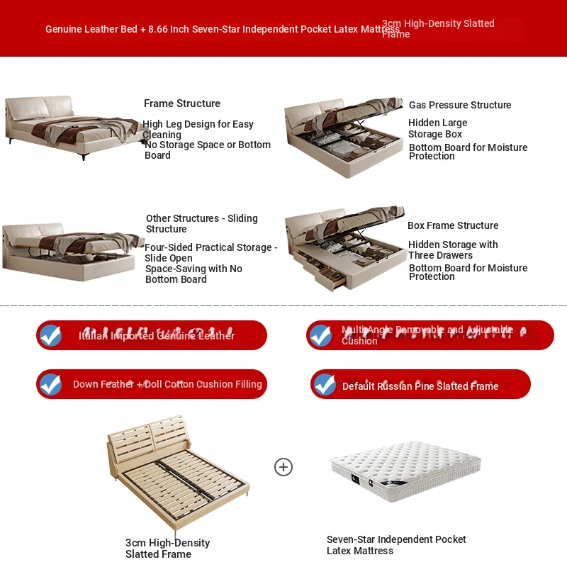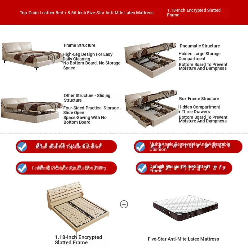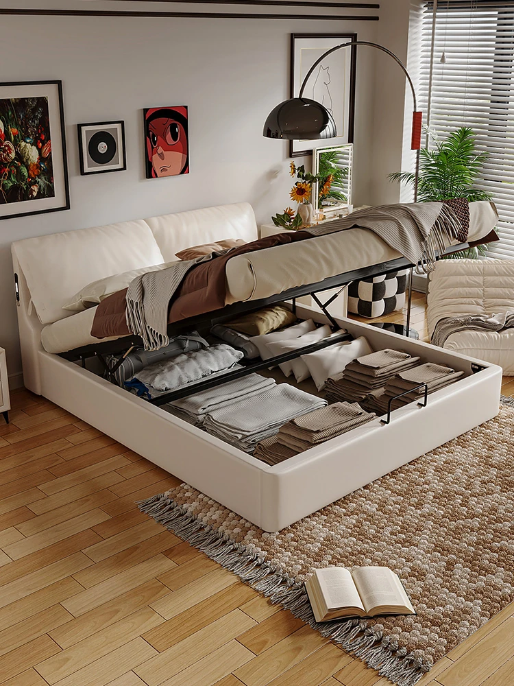 Luxury Genuine Leather Bed with Storage - Modern Minimalist Design, Cream Style Upholstered Bed for Master Bedroom, Space-Saving High-Storage Feature