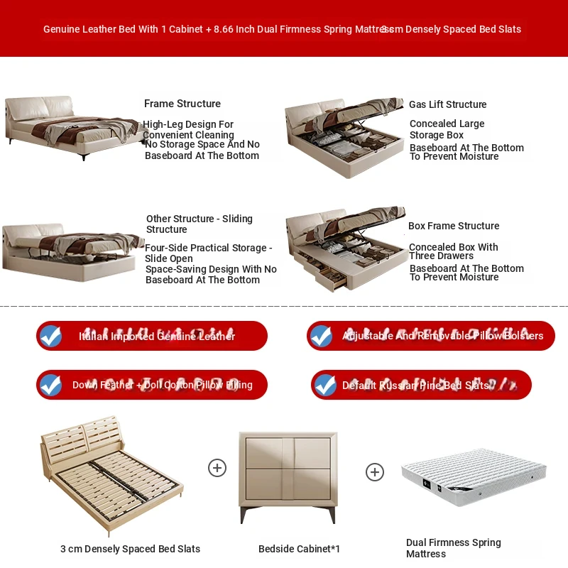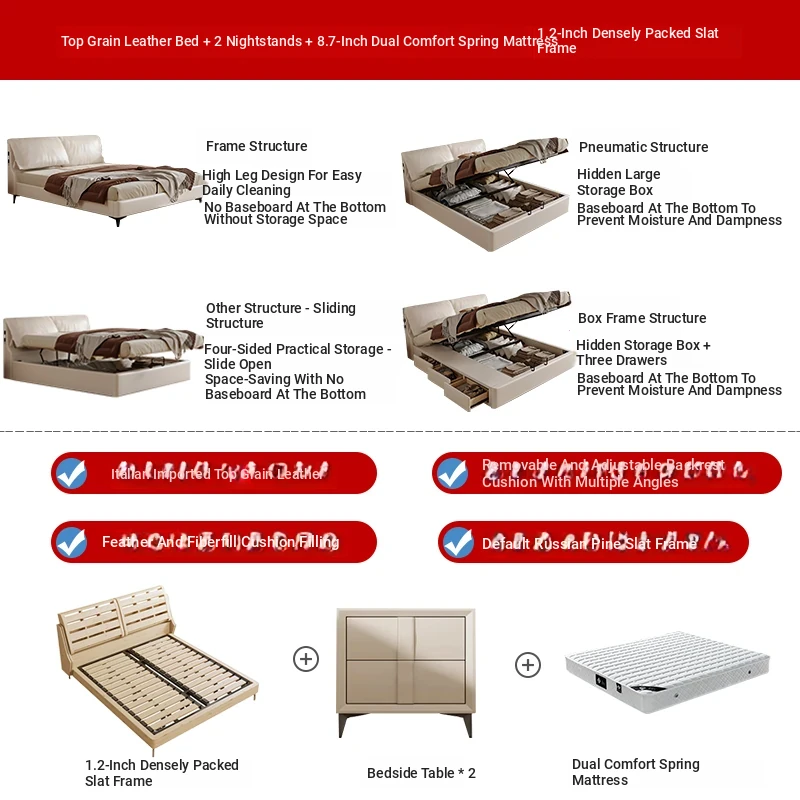 First layer cowhide bed +2 cabinets +8.66in soft and hard dual-purpose spring mattress